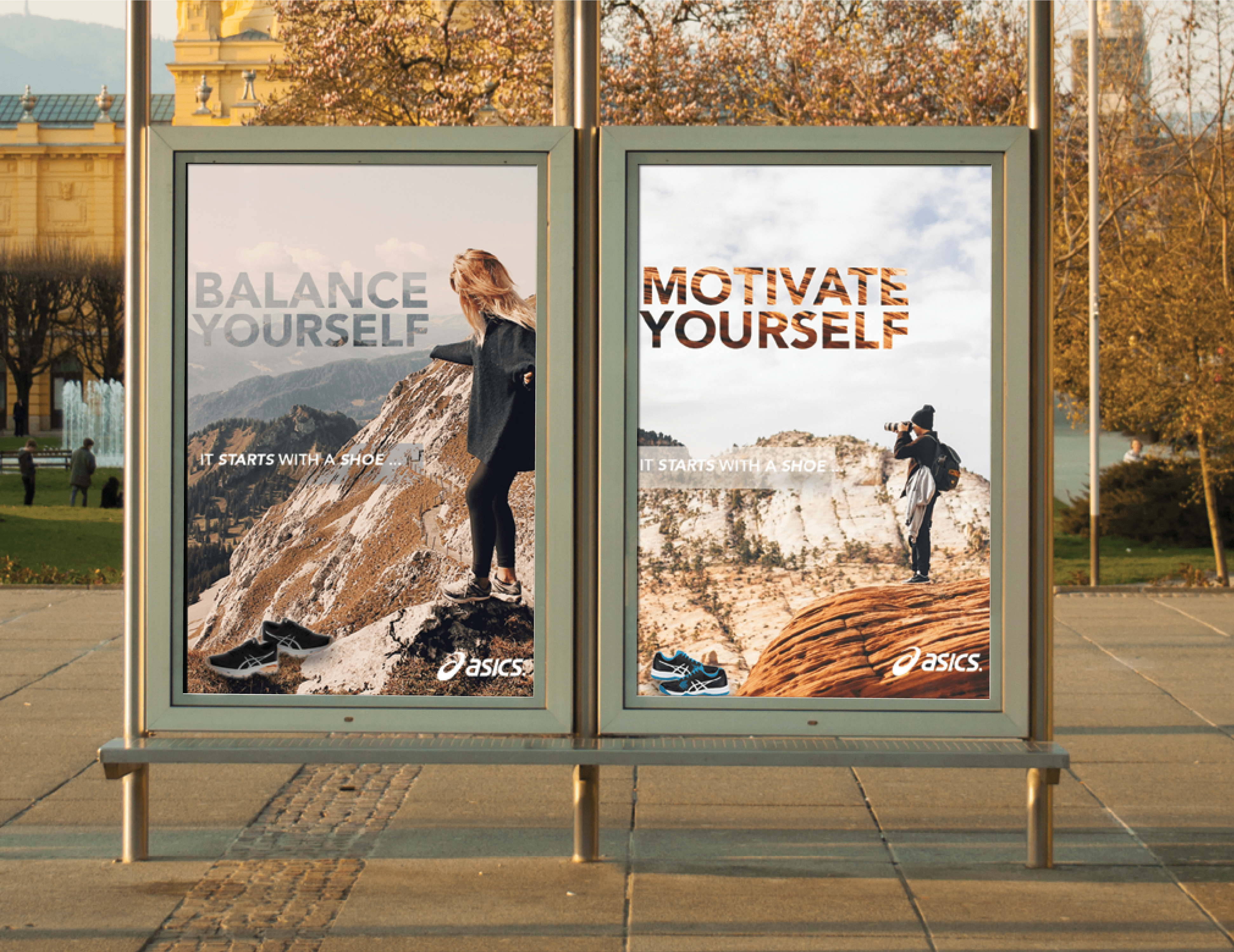 I created a series of advertisements for Asics athletic shoes using the taglines I created “it starts with a shoe” and sub taglines “innovate yourself, motivate yourself, balance yourself, transform yourself, empower yourself, believe in yourself and ground yourself”. These were used throughout the campaign series. I used photography as the main focus to create a great visual and to keep the campaign consistent. I wanted to ensure the audience recognizes the ads at first glance and can be carried over into other mediums.