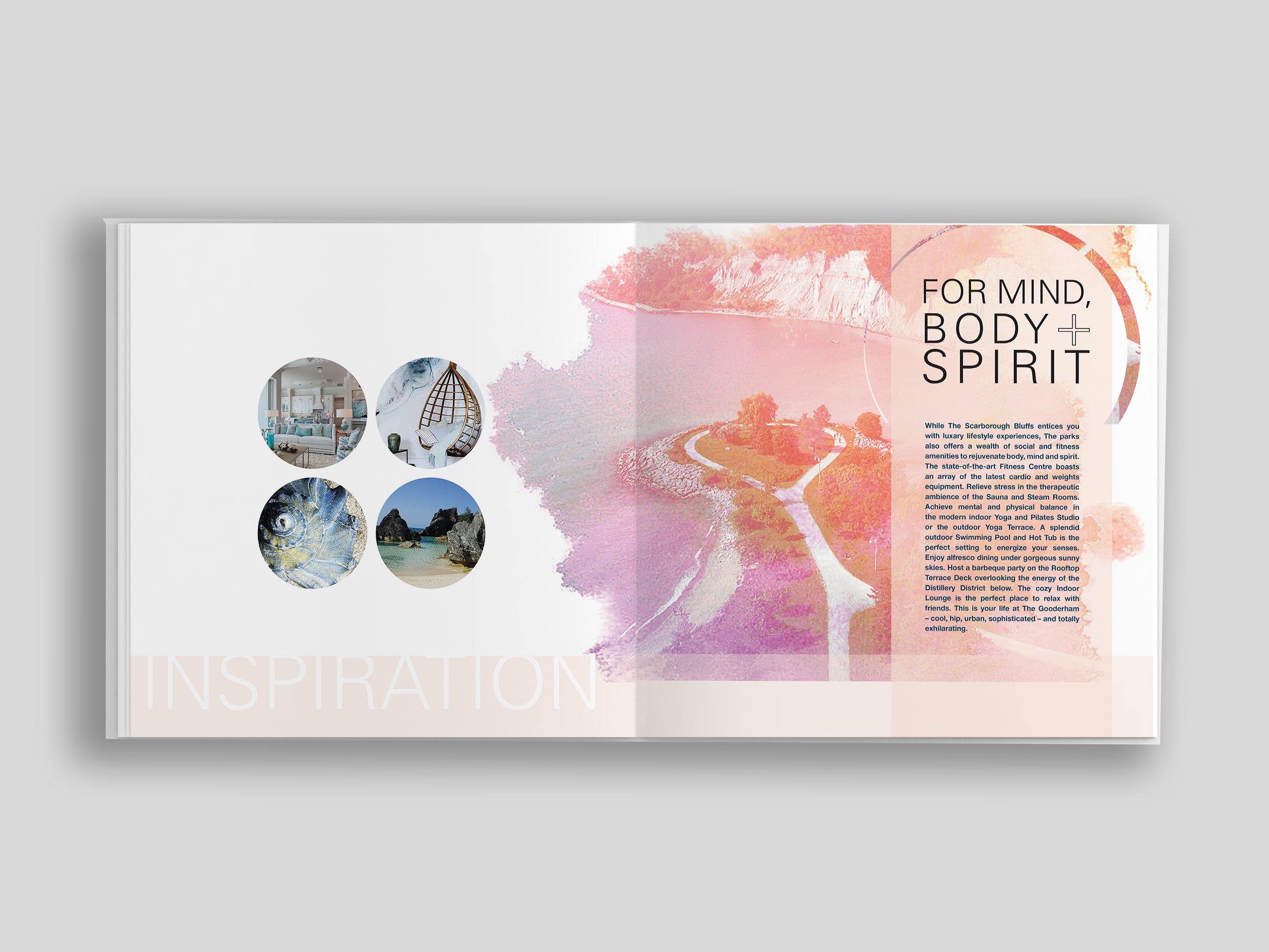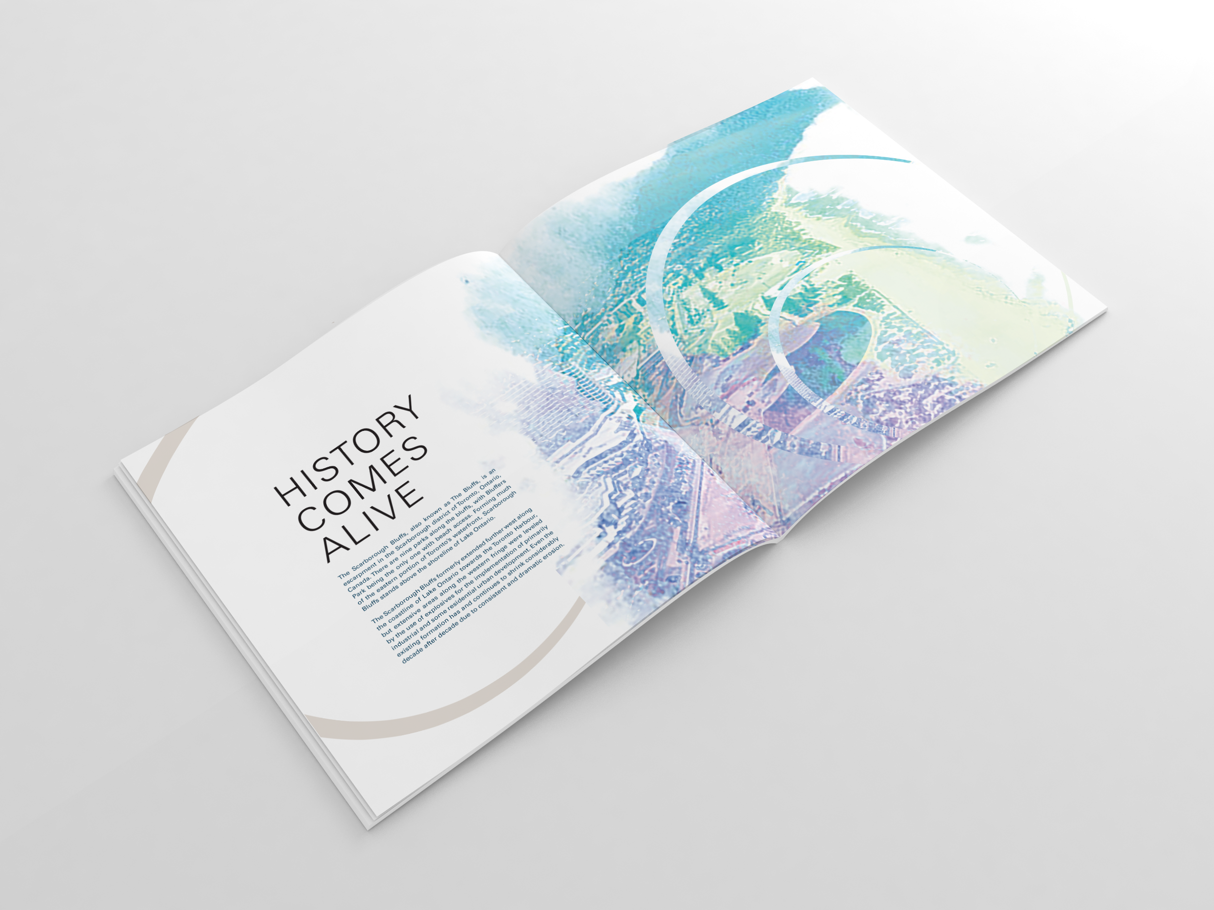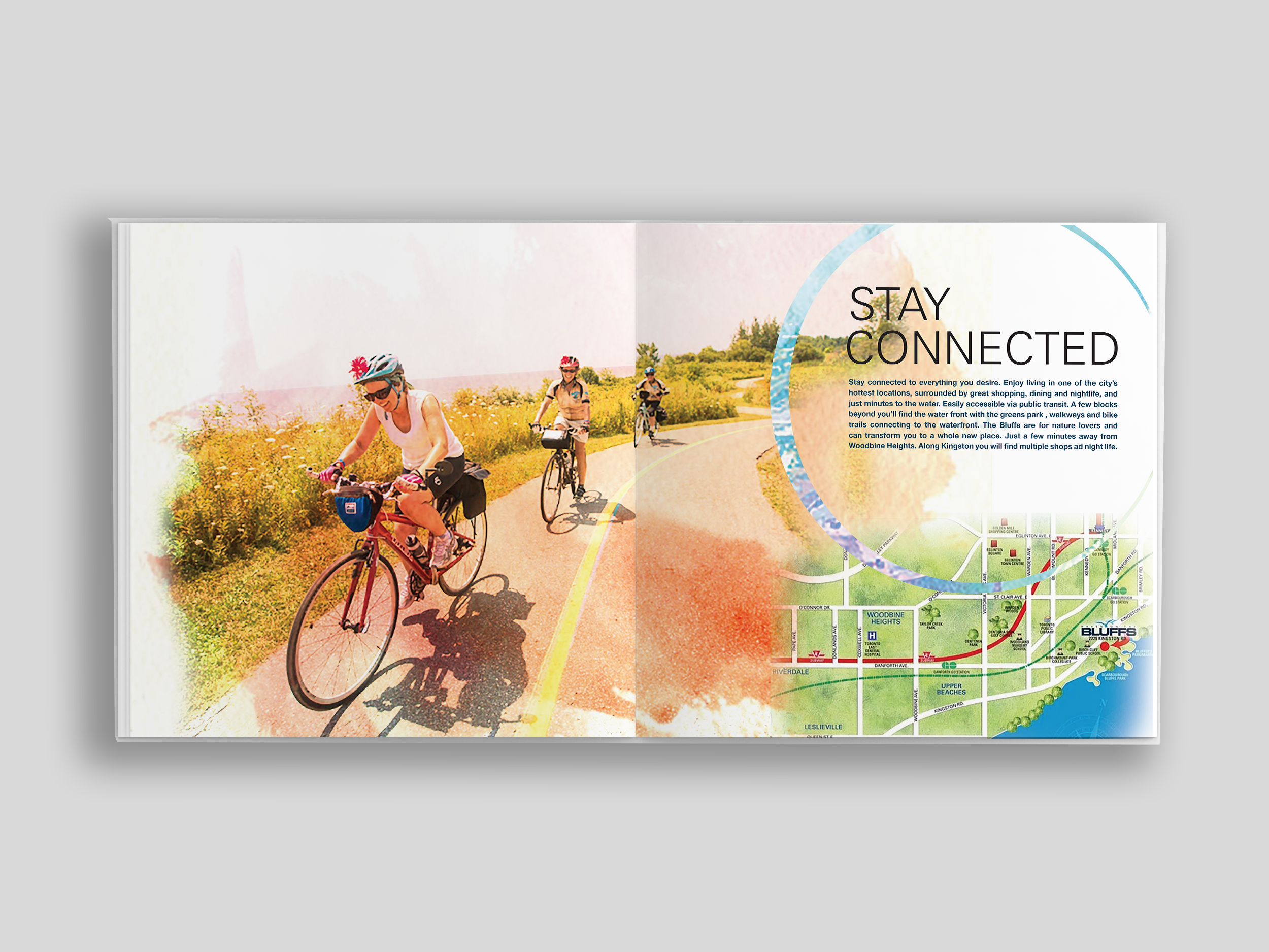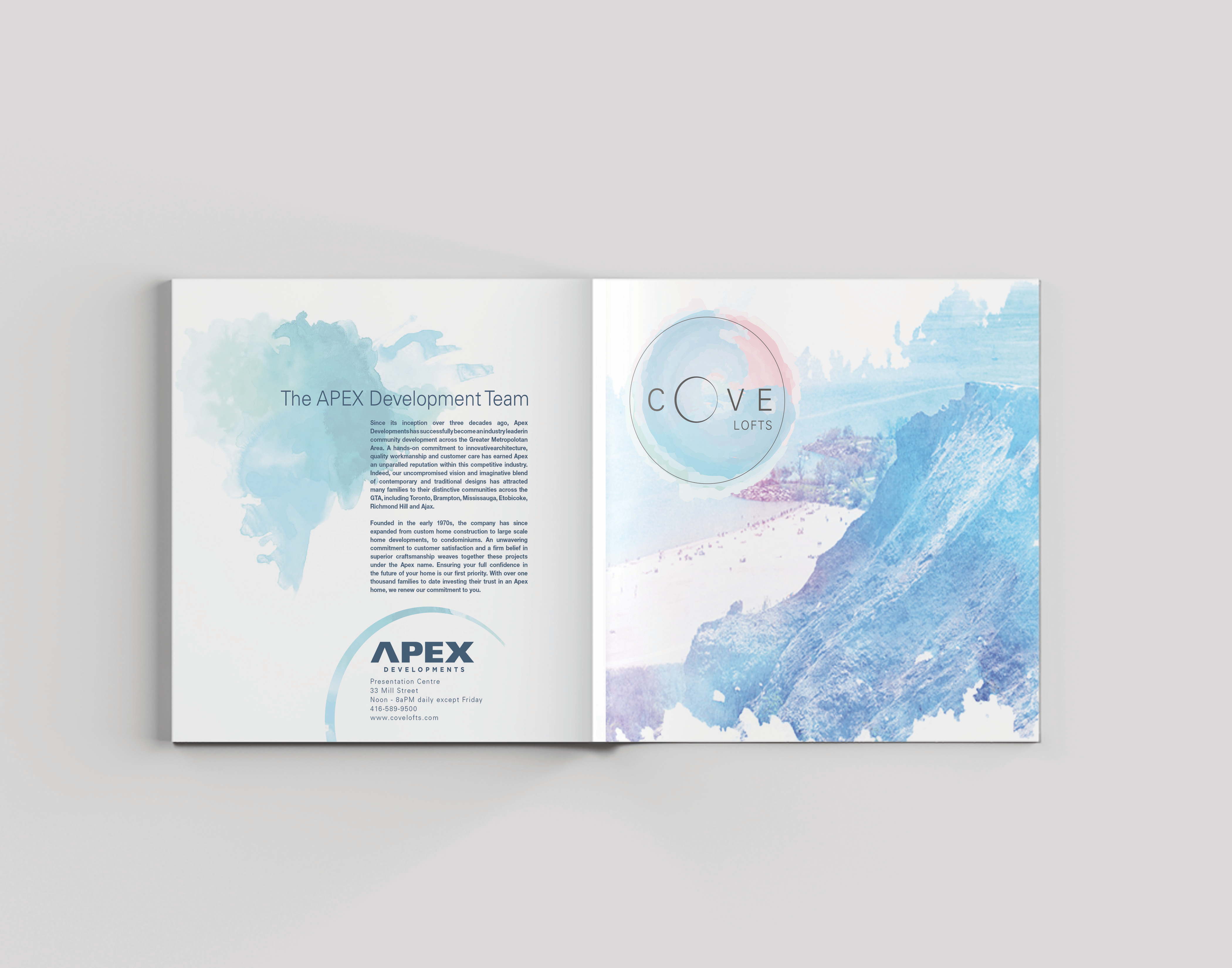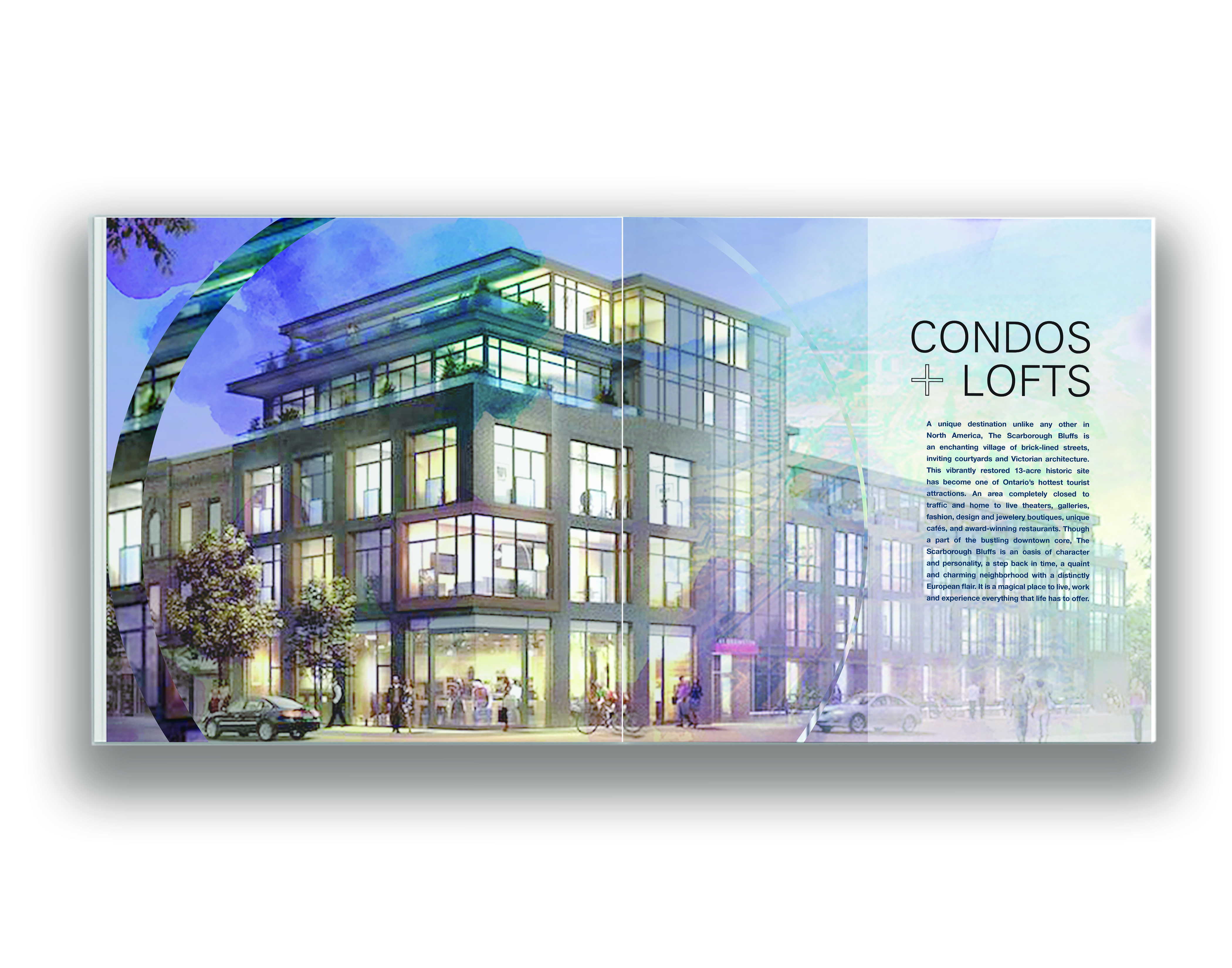 I chose the Scarborough Bluffs as the location of the condo. By choosing this location, it allowed me to create a resort like theme with having water, parks and great views depicted. I named the Condo Project “Cove” to give it the exotic feel corresponding with the watercolor strokes that are throughout the brochure which enhanced the resort theme throughout. The theme was carried over to the website for consistency.